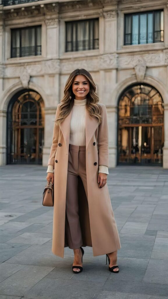 - Wool Coats & Trench Coats – Long coats in beige, gray, or plaid patterns define fall sophistication.
