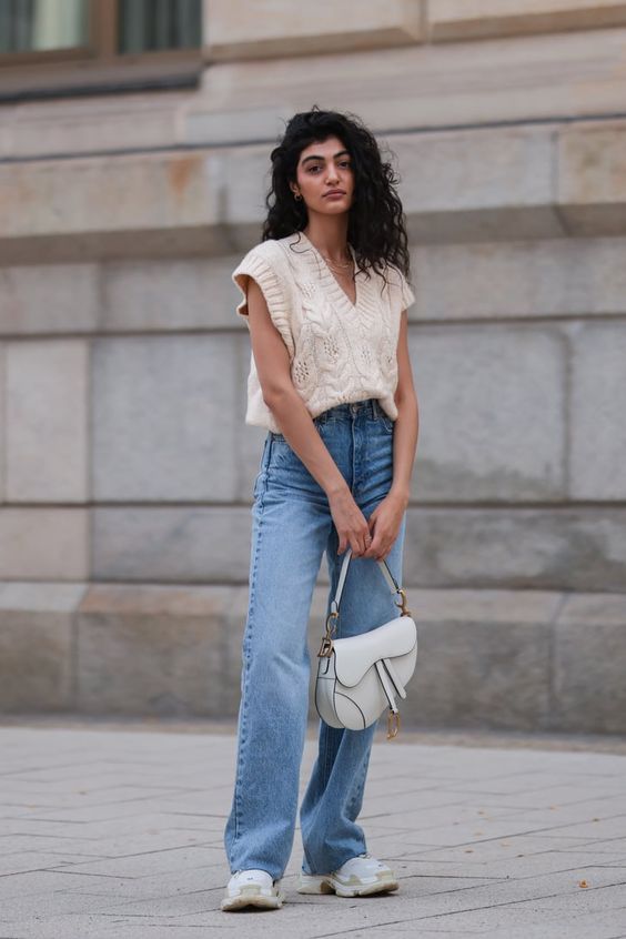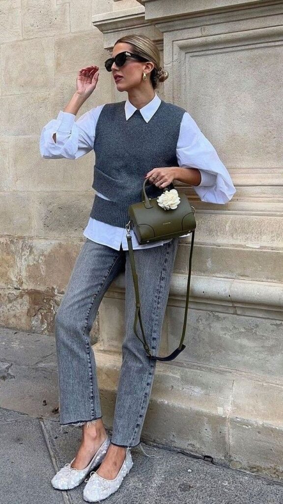 This combo is timeless. Go for a white or light blue shirt and tuck it into jeans, then top it with a vest. Add loafers or sneakers for a chic finish.