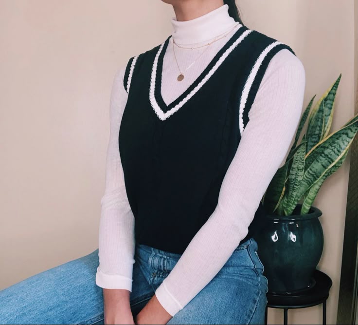 • Classic Preppy Look: A beige knitted vest over a white button-up shirt with straight-leg jeans and loafers.