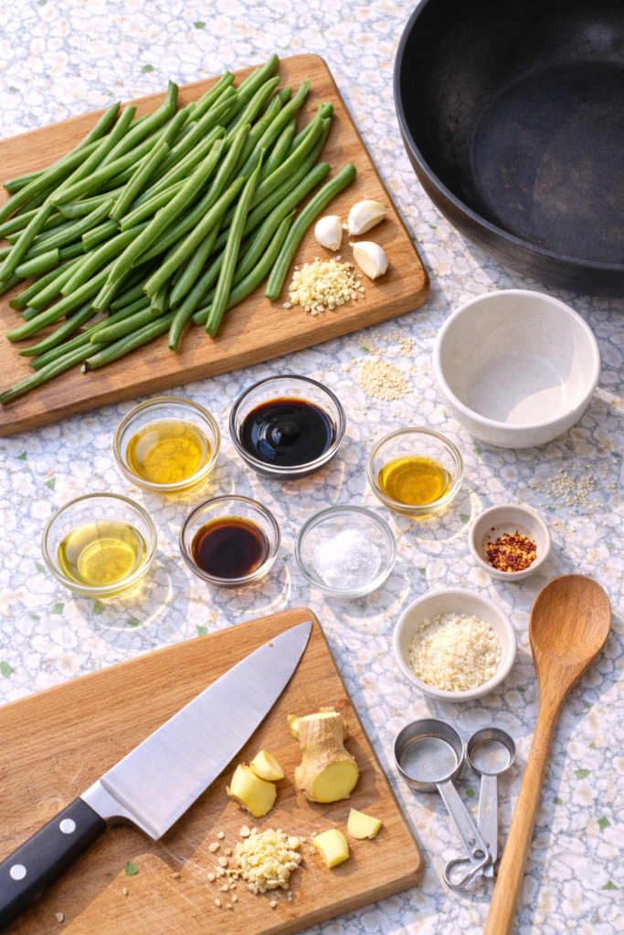Step 4: Push the beans to the side of the pan (or if you’re fancy, take them out completely). Add a tiny bit more oil if needed, then toss in your garlic and ginger. Stir constantly for about 30 seconds. The smell will be incredible.