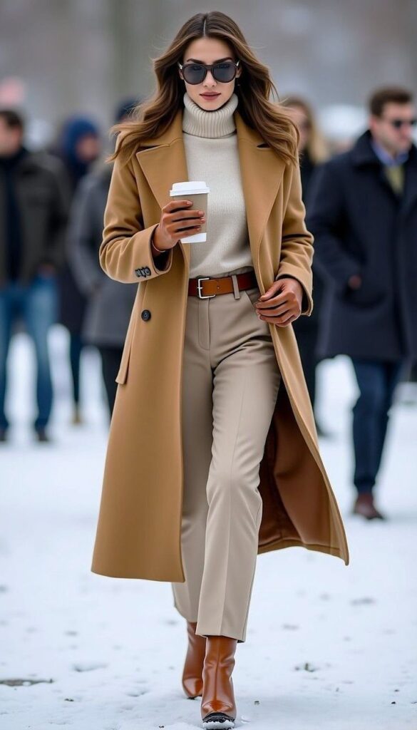 Main Piece: Camel wool coat (structured, belted waist)