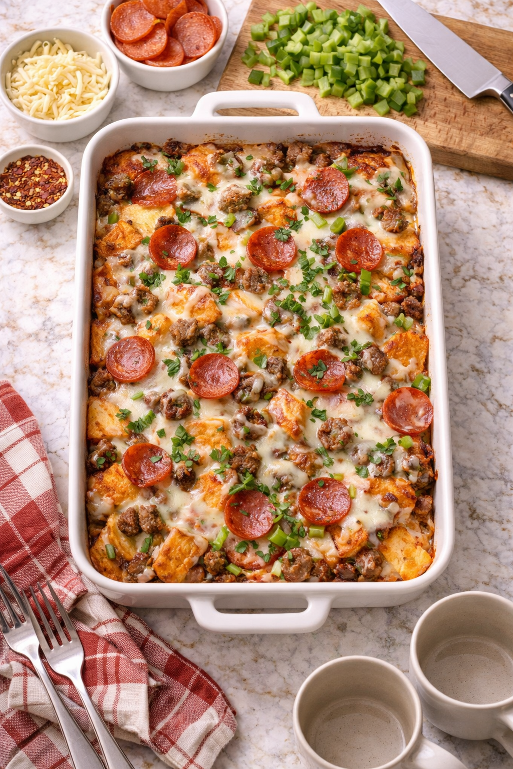 I started making this on those nights when delivery felt too expensive, but standing at the stove felt like too much effort. This recipe sits comfortably in neither camp. You dump things into a bowl, pour it into a pan, and 35 minutes later your whole kitchen smells like a pizzeria. 🍕