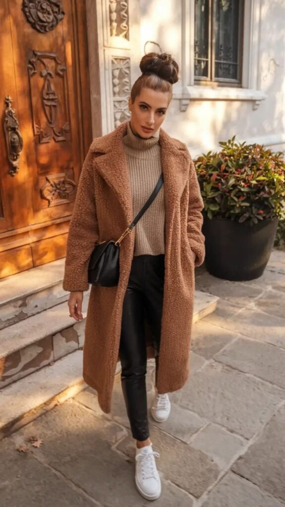 The puffer jacket is an essential for cold days. It’s trendy, practical, and pairs well with joggers or jeans for a casual look. For a more elevated aesthetic, try a long wool coat in neutral shades.