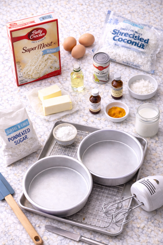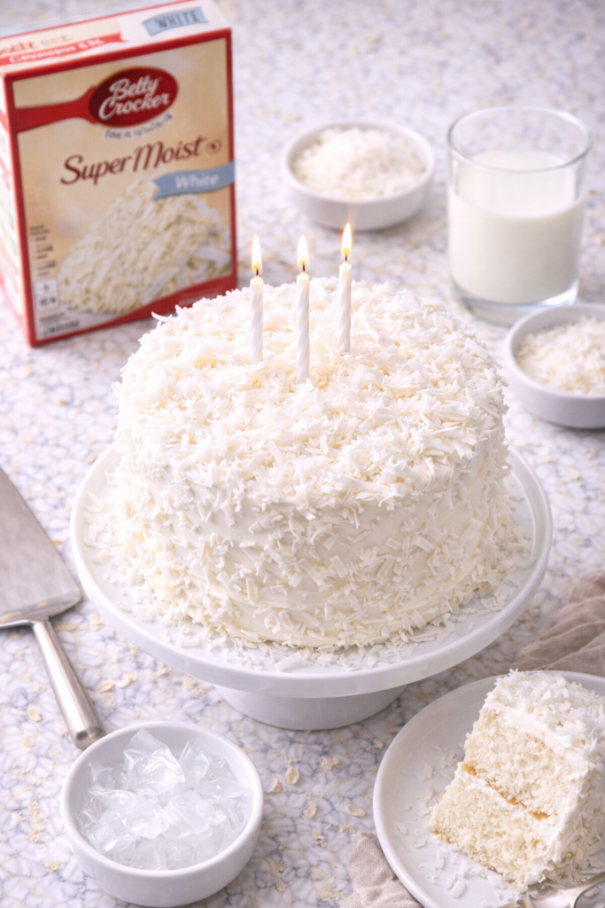 What you do to that box is what people remember. The coconut milk in the batter. The double dose of coconut extract. The toasted coconut that crackles a little when you bite into it. The frosting that tastes like it took you all day but actually took you 10 minutes.