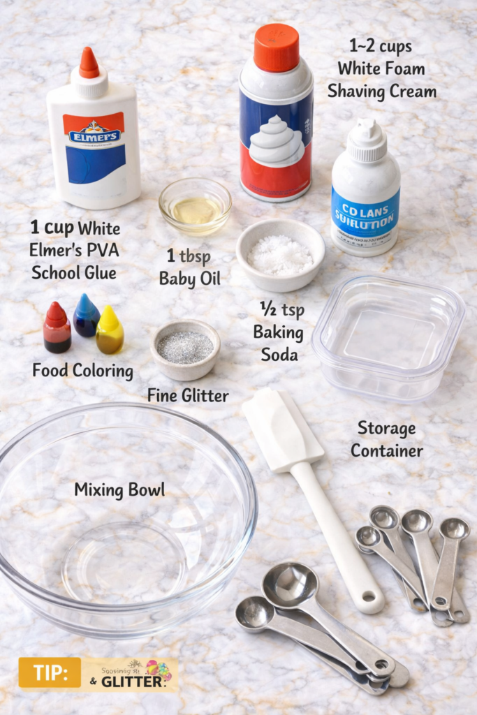 Add 1 to 1½ cups of shaving cream directly into the glue. Start with 1 cup if you want a denser slime, or go up to 2 cups for something super light and fluffy.