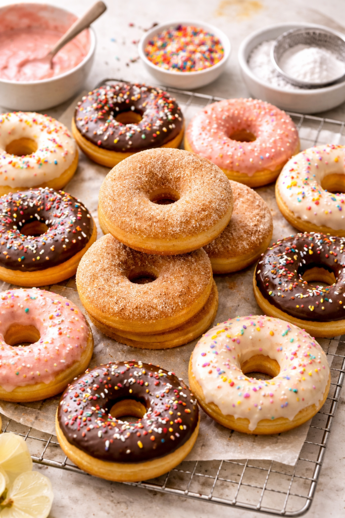 Bake for 10–12 minutes. The donuts are ready when the tops are set and spring back lightly when pressed. Don’t overbake — erring on the side of 10 minutes keeps them moist inside.