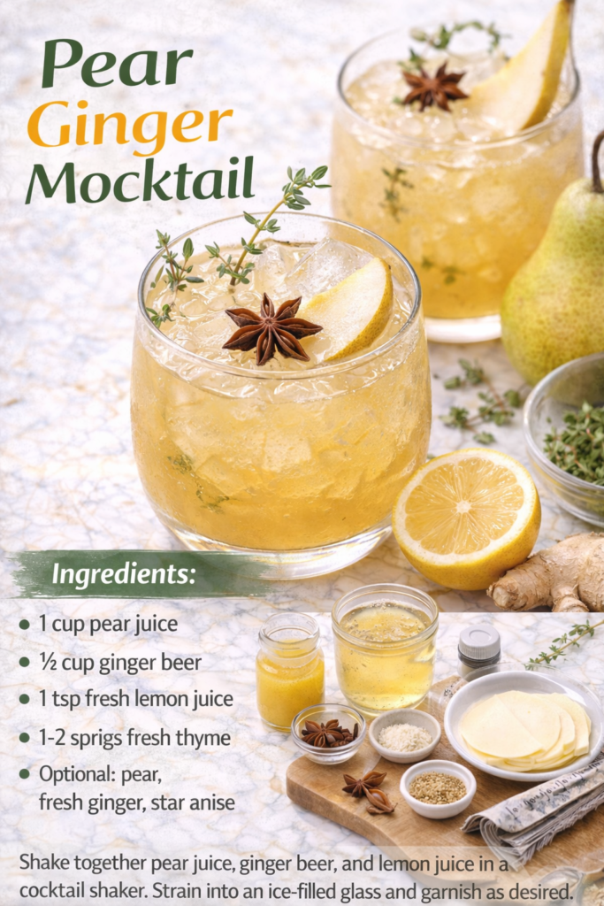 Meal pairings: This mocktail pairs beautifully with light salads, soft cheeses, grilled salmon, charcuterie, and surprisingly, spicy dishes. The sweetness of the pear balances heat really well.
