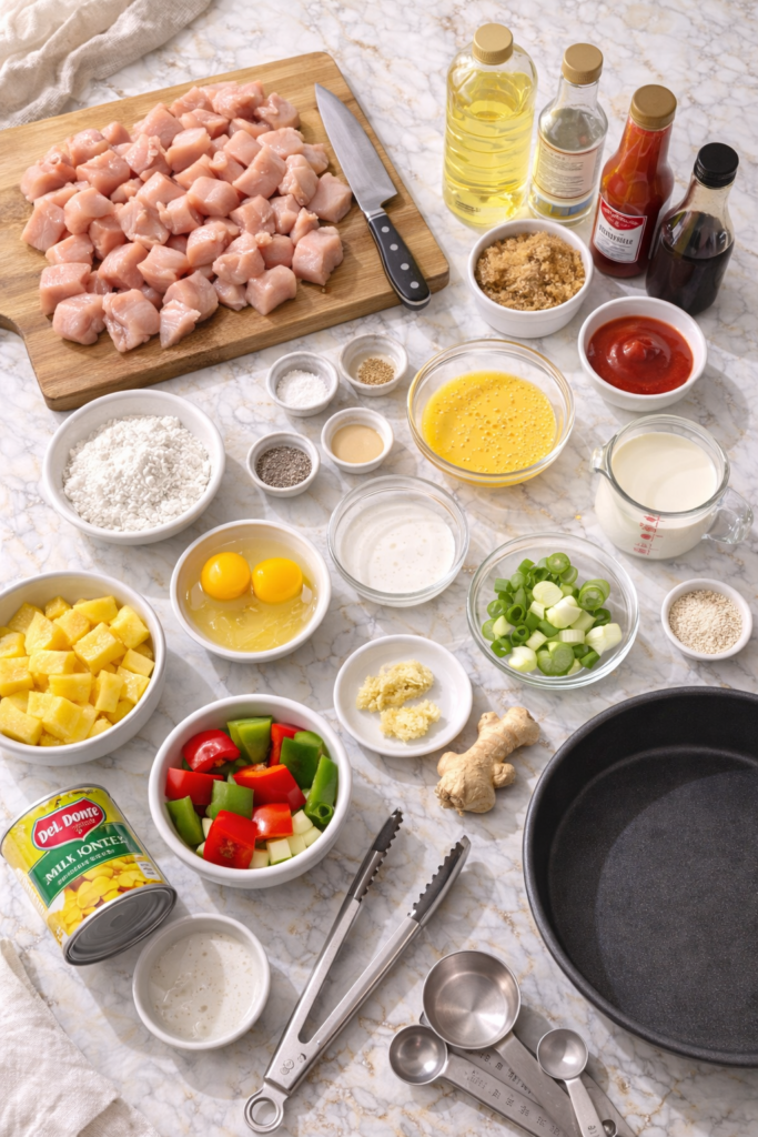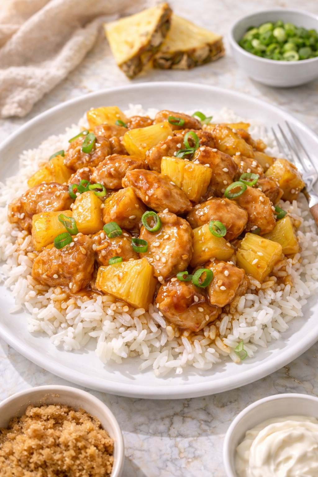 This recipe uses real pineapple chunks (canned works too, don’t stress), a simple sauce that comes together in minutes, and tender chicken that gets perfectly crispy without deep frying.
