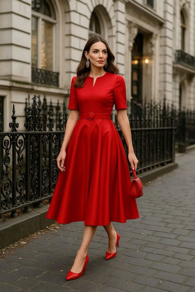- Work / Semi‑Formal: Keep sleeves on, pair with low block heels. Add small stud earrings that echo the gold in the pin. A structured handbag. Hair tidy; accessory light elsewhere so the pin gains prominence.