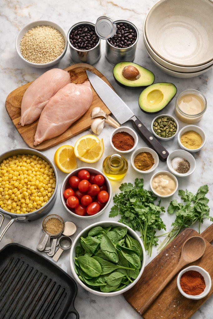 6. Assemble the bowls. Start with a base of quinoa. Add a handful of spinach or arugula (the heat from the quinoa wilts it slightly). Layer on black beans, corn, cherry tomatoes, and red onion. Fan the sliced chicken over the top. Add avocado slices last so they don’t brown.