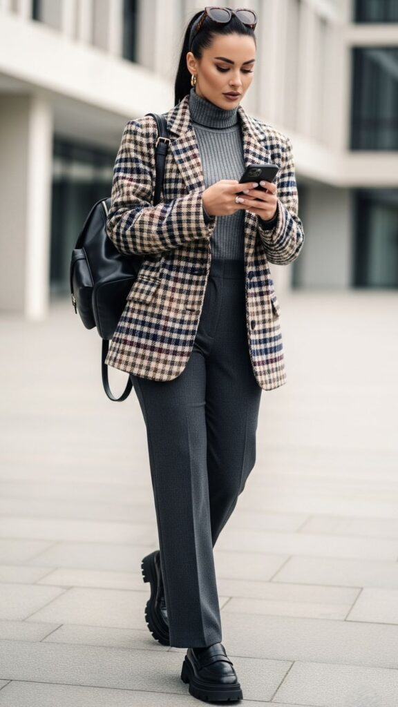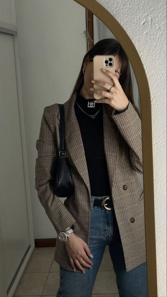 • Pair a plaid or oversized blazer with high-waisted jeans and a chunky sweater.